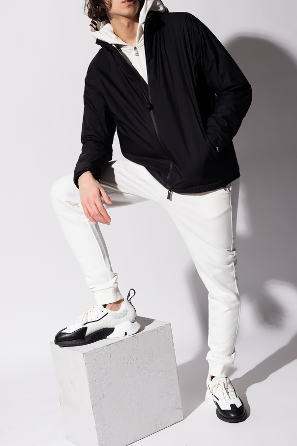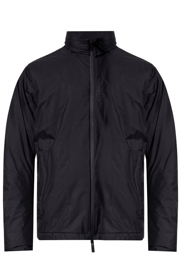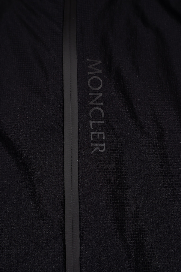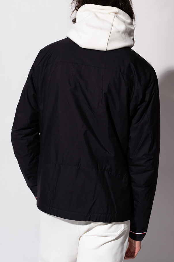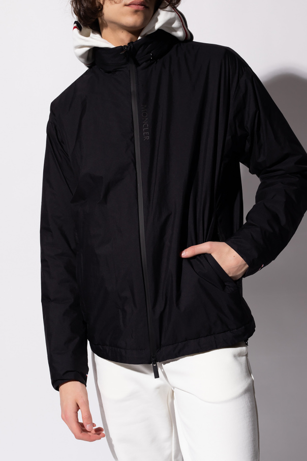 Black \'Itier\' jacket from Moncler. Printed with the brand\'s logo, this style features a two-way zip fastening, two zipped pockets on the front, navy blue, white and red appliqués on the sleeves and a cinching drawstring at the bottom hem.