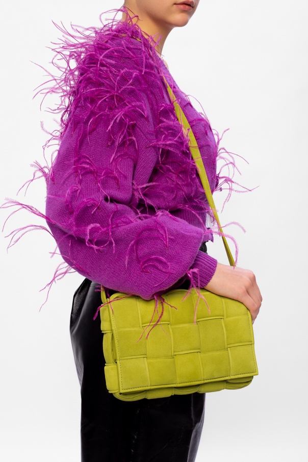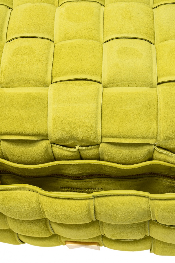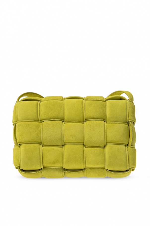 Green ‘Padded Cassette‘ shoulder bag from Bottega Veneta. Size small. Crafted from suede with the iconic Intrecciato weave, this design features a snap fastening, adjustable shoulder strap with a triangular buckle, gold-tone metal hardware and one internal compartment with one zip pocket and one slip pocket.