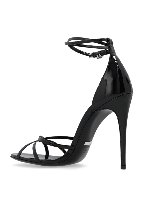 Black heeled sandals from Gucci. Made of patent leather, this design features a buckled ankle strap ‘Double G’ appliqué, decorative knot at the front and a black leather sole.