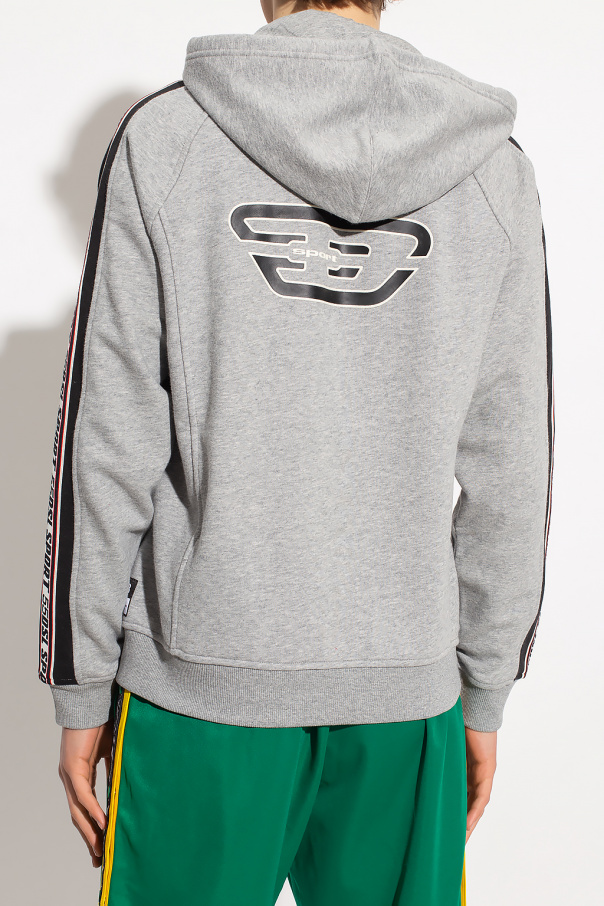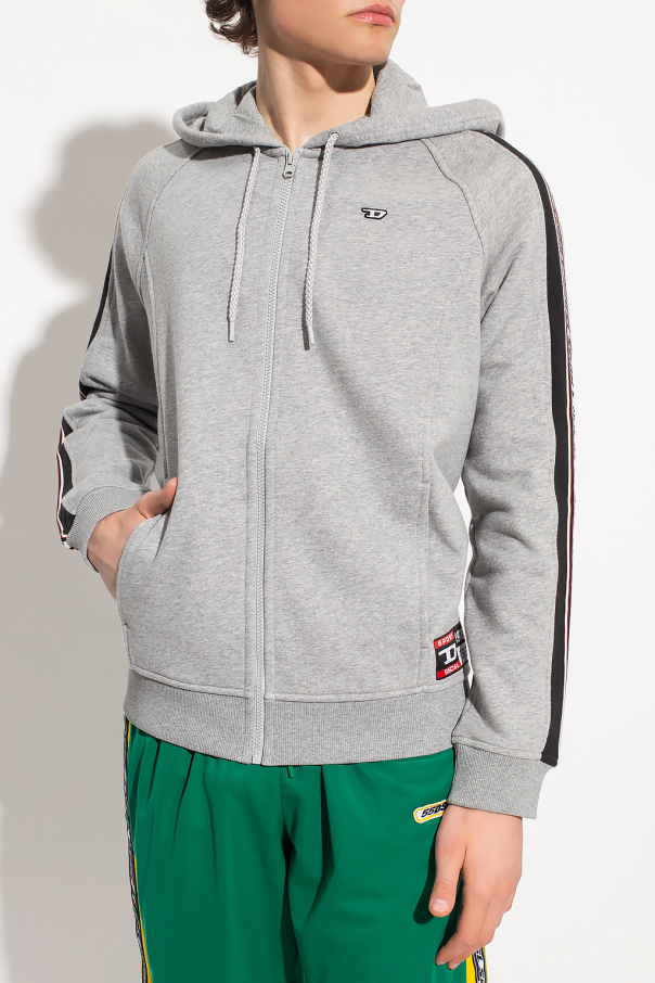 Grey and black \'AMST-TRASTEER-HT01\' hoodie from Diesel, the ‘Diesel Sport’ collection. Made of moisture-wicking fabric that stays dry, this design is complete with a zip fastening, drawstring hood, logo detail, two front pockets and ribbed trims at the hem and cuffs.
