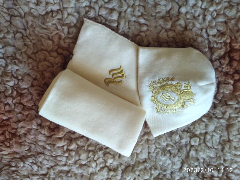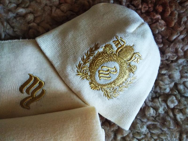 Красивая вышивка-эмблема спереди, сзади по краю название марки золотой нитью. Шапка и шарф двойной вязки.