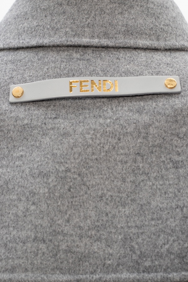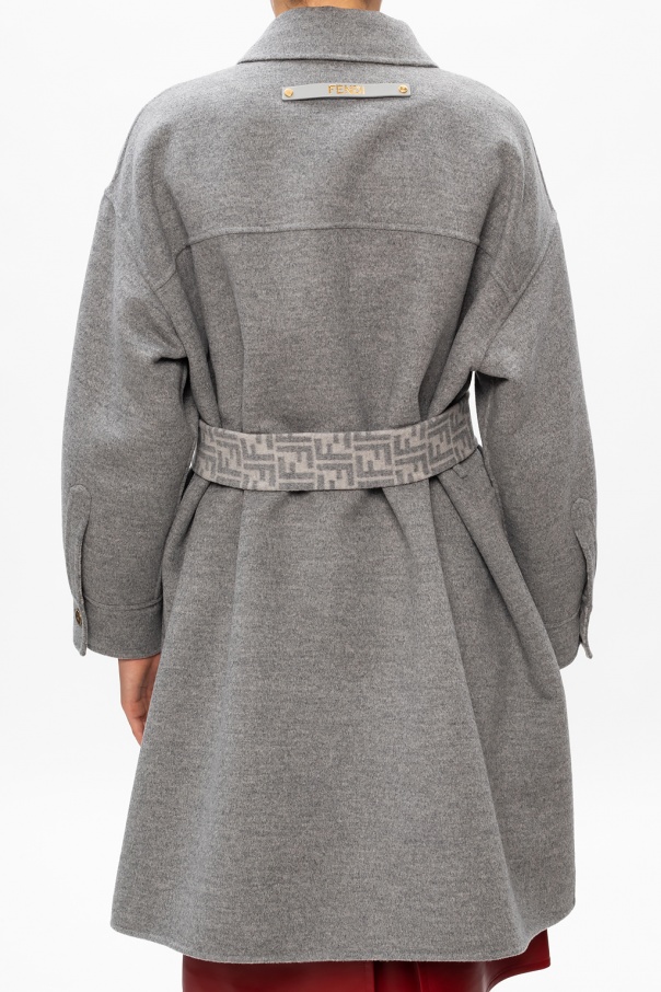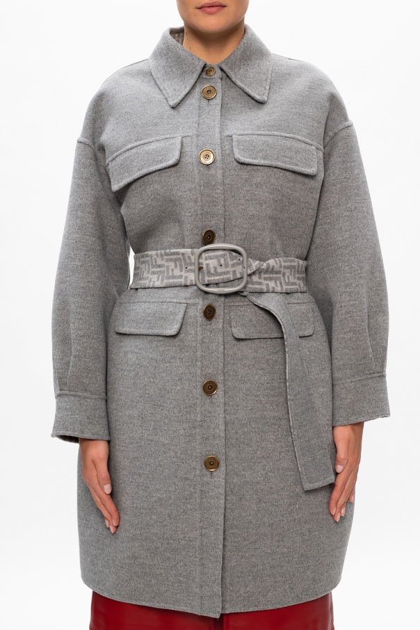 Grey coat from Fendi. Crafted from wool, this item features antiqued gold-tone buttons, four flap pockets on the front and a removable buckle belt.