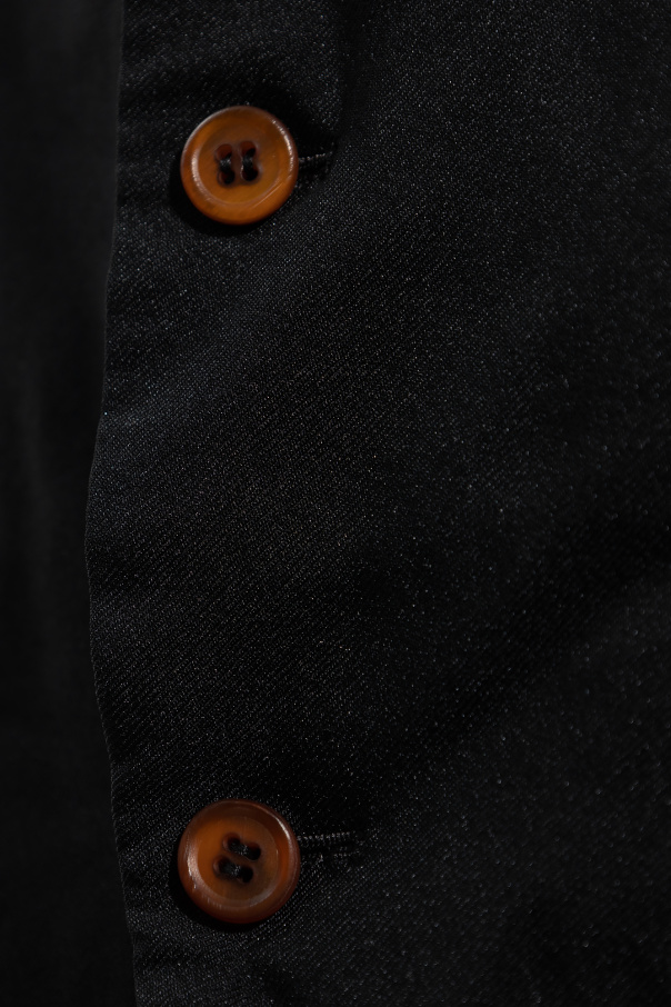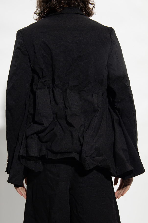 Black blazer from Comme des Garcons Homme Plus. Fastened with buttons, this garment features two slip pockets, two flap pockets, notch lapels, long sleeves and decorative asymmetric trimming at the back.