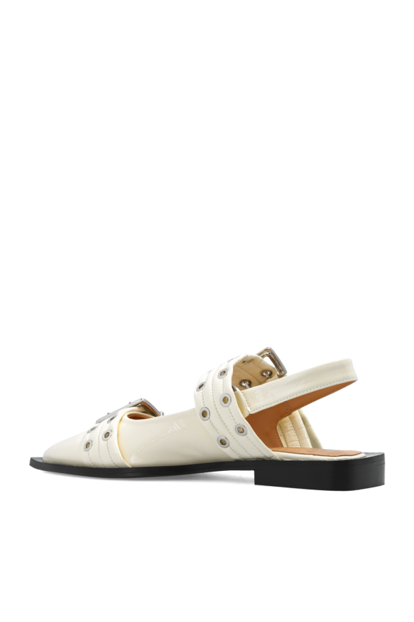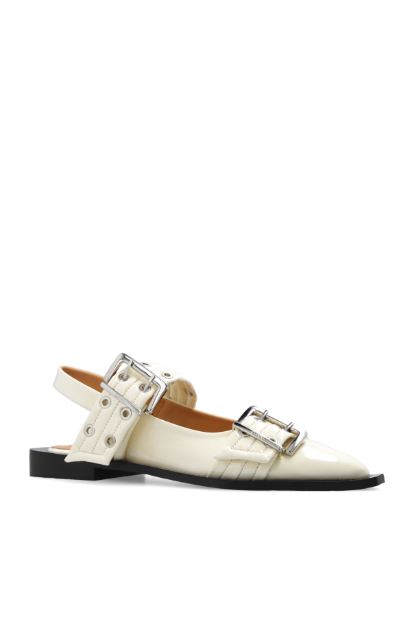 Cream shoes from Ganni. Made of faux leather, this pair sits on a black rubber sole and features buckle straps and an elastic strap at the back.
