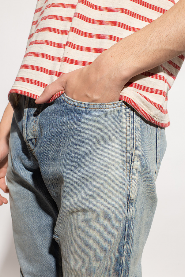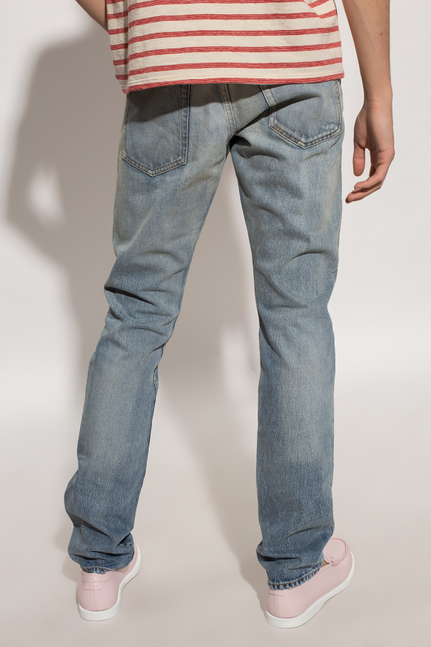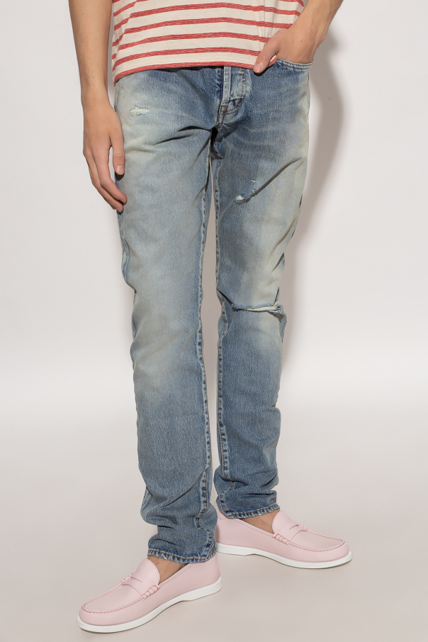 Blue and beige skinny jeans from Saint Laurent. Falling with slightly tapered legs, this pair features a low-rise waist, button fastenings, classic five pockets, a back logo patch and a distressed treatment.