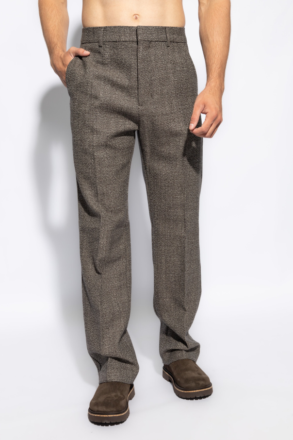 Introducing the quintessence of sartorial excellence: our Pressed Wool-Cotton Trousers by the renowned designer Ami Alexandre Mattiussi. Crafted from a sumptuous blend of wool and cotton, these trousers present a deep, textured brown hue with subtle hints of black and cream, lending an air of sophistication and depth to the fabric\'s appearance. Featuring a classic cut typical of formal or business attire, these trousers are meticulously designed with a precise crease down the legs, enhancing their elegant silhouette. The absence of visible logos or branding elements underscores the design\'s focus on quality and craftsmanship, making it a preferred choice for those who value understated elegance. The trousers are equipped with a zipper, hook, and button closure, ensuring a secure and sleek fit. The presentation on the model reveals a flattering fit with a gentle taper towards the hem, showcasing the silhouette while allowing for comfortable movement, indicative of the fabric\'s softness and flexibility. Paired effortlessly with upscale attire, these trousers are a testament to timeless style and refined taste. Why Choose These Trousers? Exquisite material blend of wool and cotton for ultimate comfort and durability. Elegant deep brown color with a unique melange effect, adding texture and sophistication. Classic cut with a precise crease for a polished look. Subtle details, including a zipper, hook, and button closure, that underscore the trousers\' luxurious simplicity. Designed by Ami Alexandre Mattiussi, a symbol of modern elegance and sartorial craftsmanship.