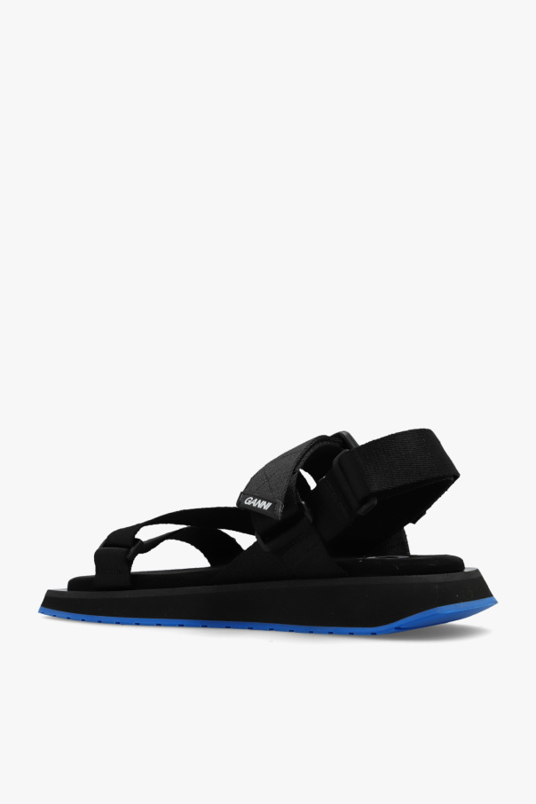 Black sandals from Ganni. Sitting on a lightweight sole in black and dark blue EVA foam, this model showcases a square toe, the brand\'s logo and adjustable straps featuring snap and velcro closures.