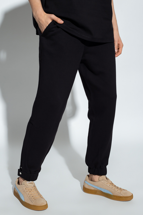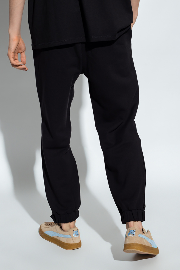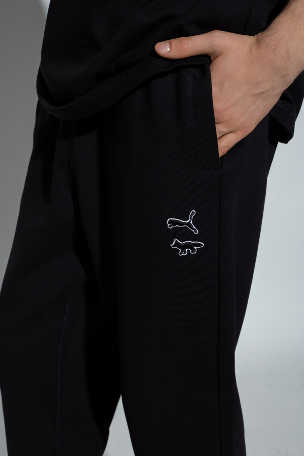 Black sweatpants from Puma x Maison Kitsuné. Made of cotton and emblazoned with two black and white logo patches, this pair features an elasticated waistband with a drawstring fastening, two side seam pockets, one back zipped pocket and zipped and elasticated cuffs with snap closures.