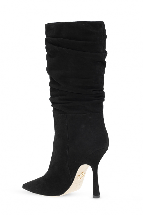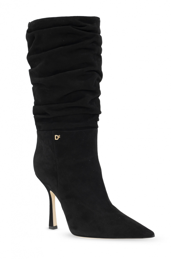 Black ‘Blair’ heeled ankle boots from Dsquared2. Made of suede, this pair features a metal logo appliqué in gold-tone, decorative gathers and a beige leather sole.