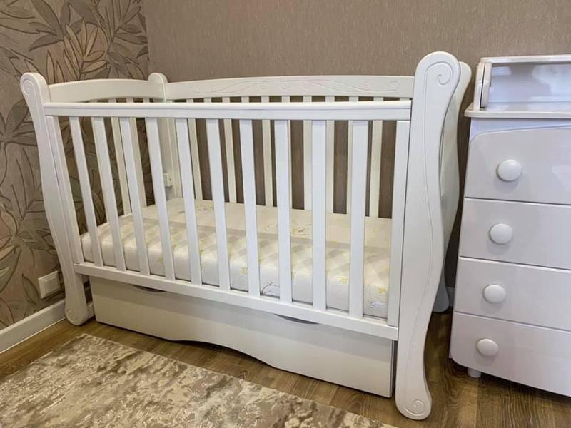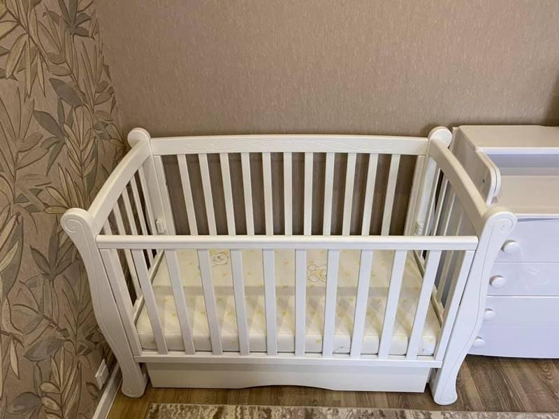 Ребенок в ней не спал, можно сказать новая. Продаю дешевле и с матрасом. Матрас ортопедический, внутри волокно. Не мягкий. Чехол на матрасе на молнии. В кроватке есть маятник. Одна сторона регулируется выше ниже.
