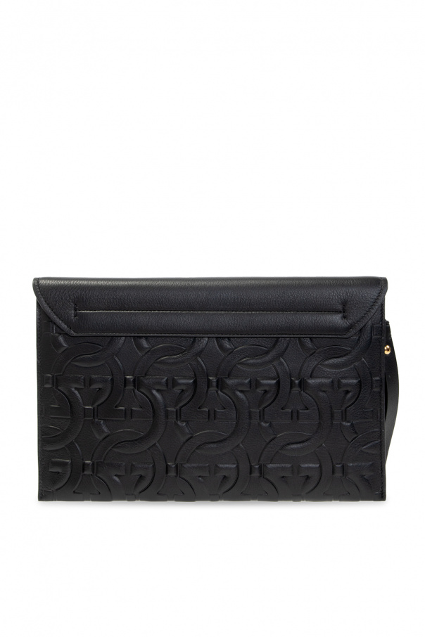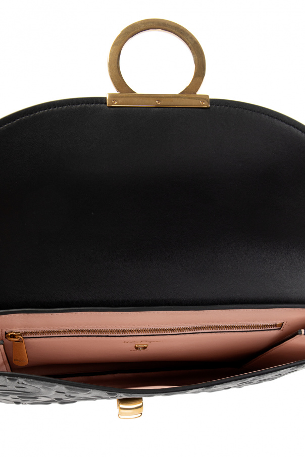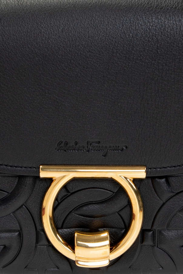 Black ‘Margot’ hand bag from FERRAGAMO. Crafted from calf leather, this model features a decorative logo closure and is complete with a wrist strap, gold-tone metal hardware and one internal compartment with one zip pocket.