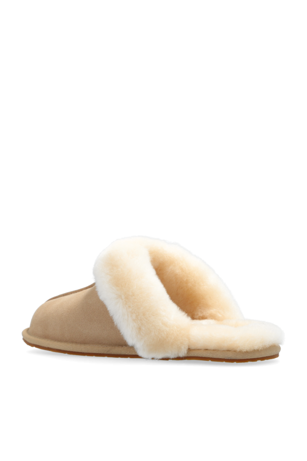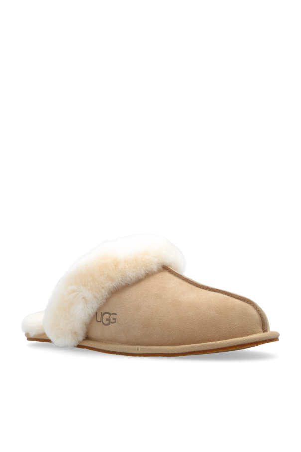 Beige ‘Scuffette’ slippers from UGG. Made of suede and trimmed with cream sheep fur, this model sits on a brown rubber sole and features an embossed logo on the side.