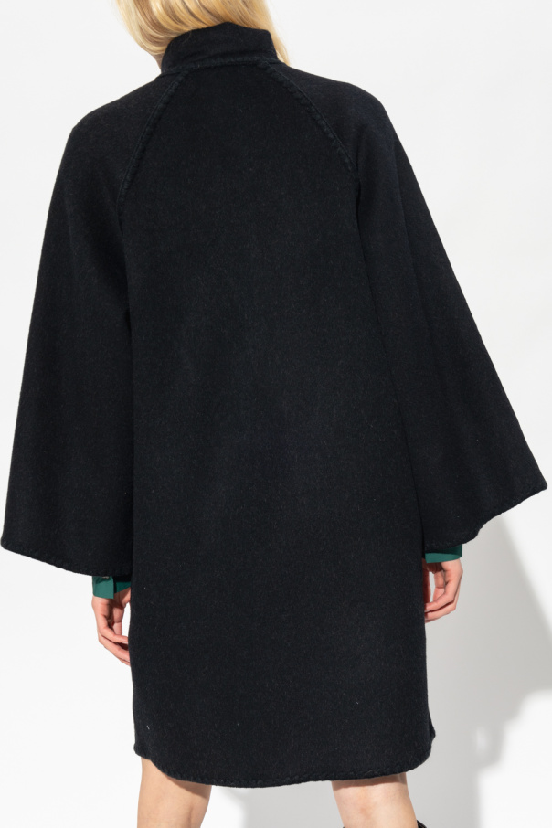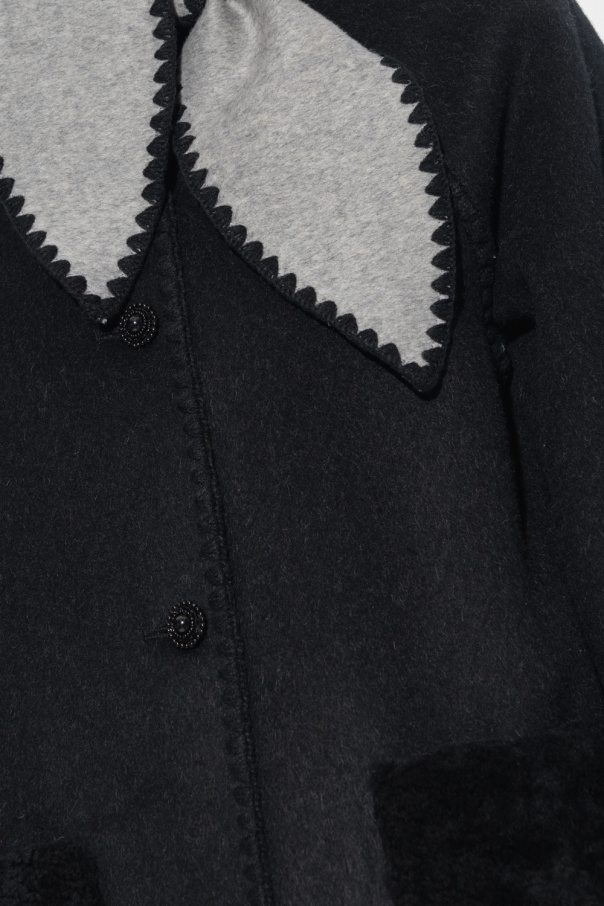 Black and grey ‘Idarose’ coat from Custommade. Made of wool, this style features decorative topstitched flaps, button closures, long sleeves and two shearling pockets.