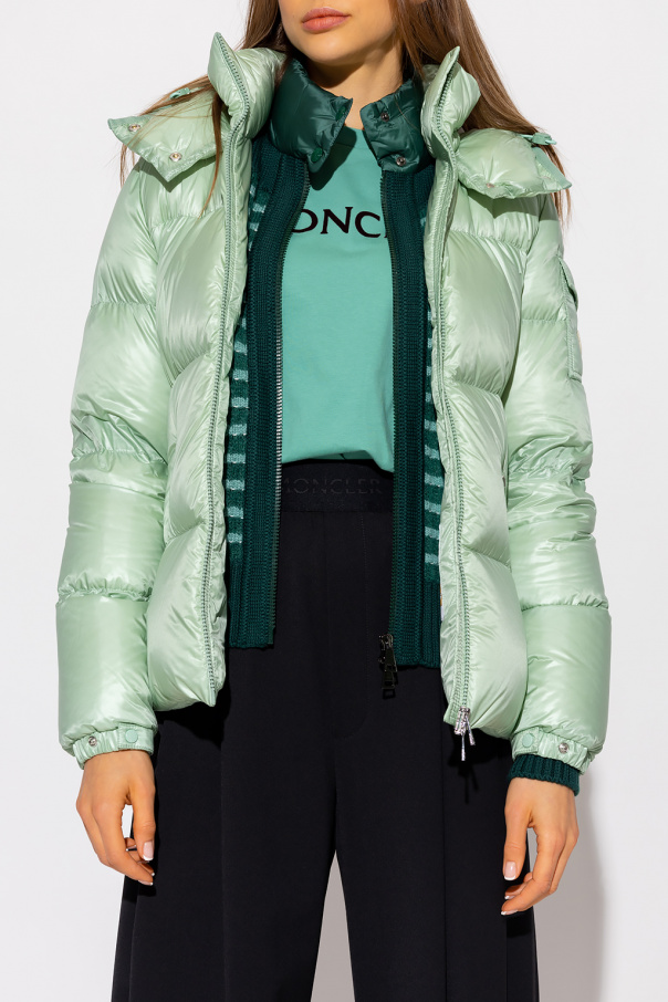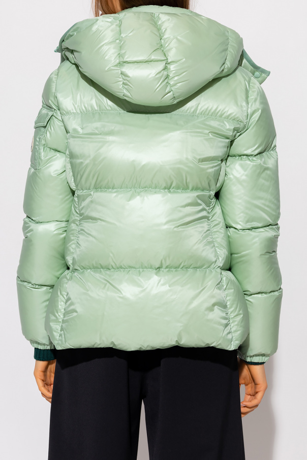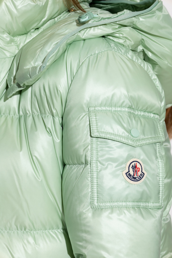 Light green ‘Fourmine’ jacket from Moncler. Filled with down, this style secures with a two-way zip and features a detachable drawcord hood, two zip front pockets and long sleeves – one of which has a colourful logo patch and snap-fastened flap pocket.