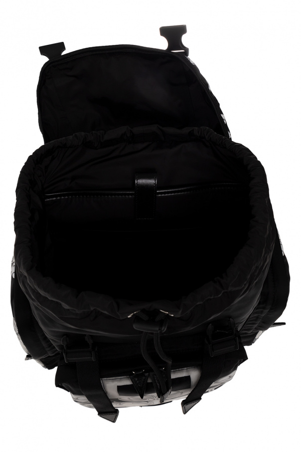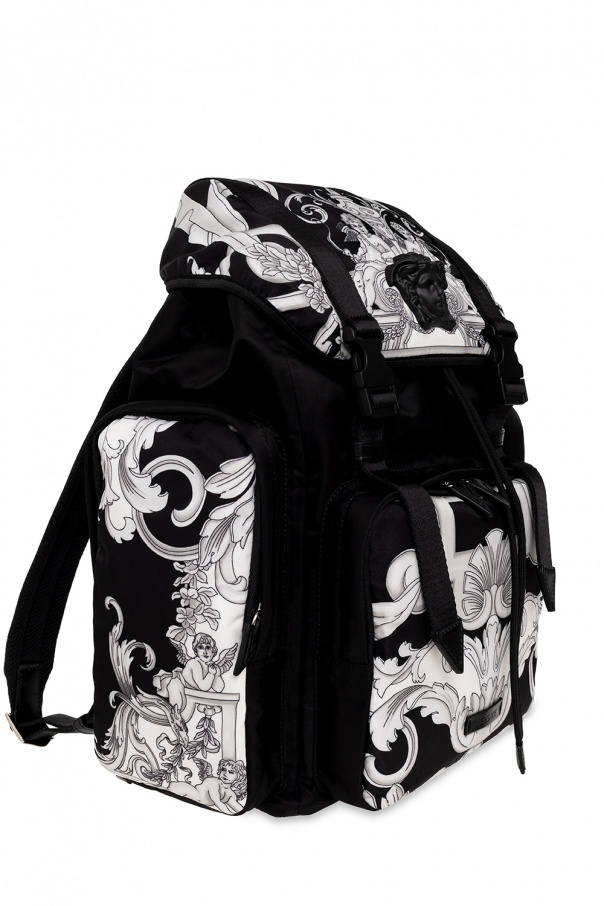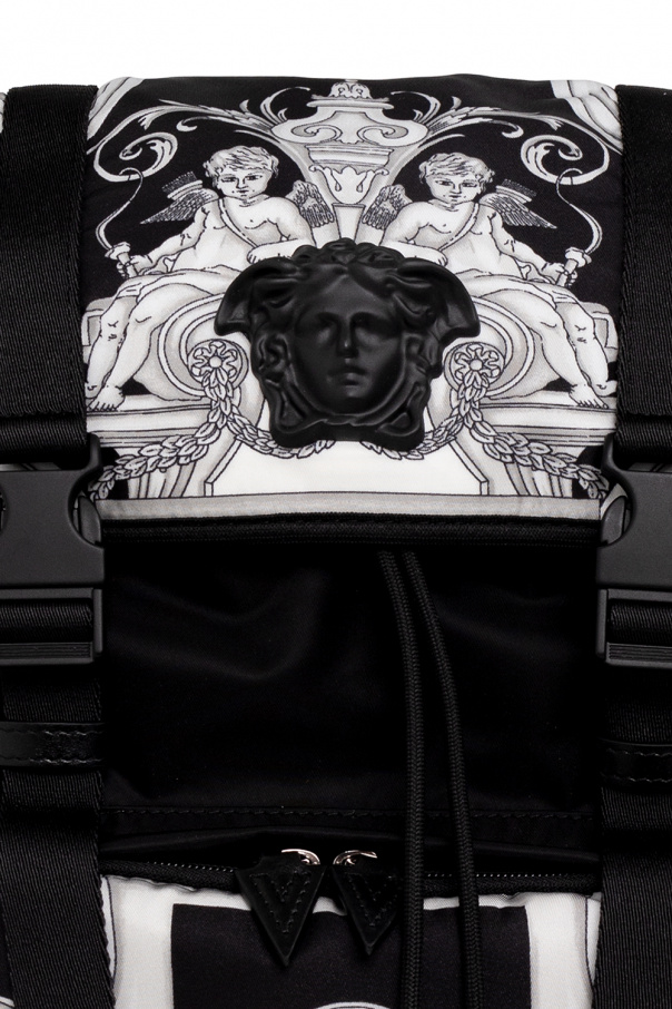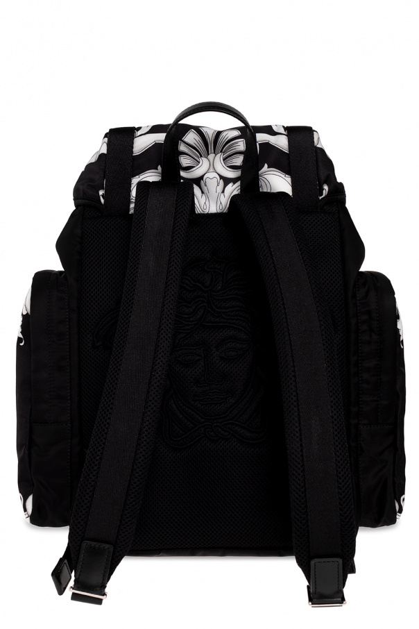 Black backpack from Versace. Embellished with the brand's signature grey and black ‘Baroque’ pattern, this design cinches closed with drawstring and features snap fastenings, a three-dimensional Medusa application, a logo patch, three zip pockets (one on the front and two on the sides), a half-round handle, adjustable shoulder straps and one internal compartment with one snap-fastened pocket and one slip pocket.