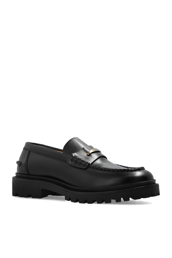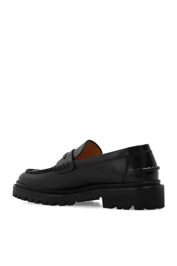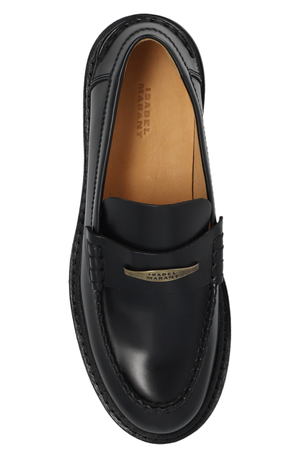 Black ‘Frezza’ loafers from Isabel Marant. Resting on a black rubber sole, this design features a strap with a metal logo-engraved detail in antique gold-tone.