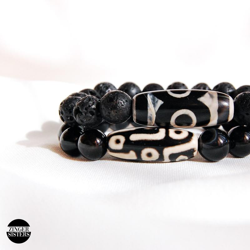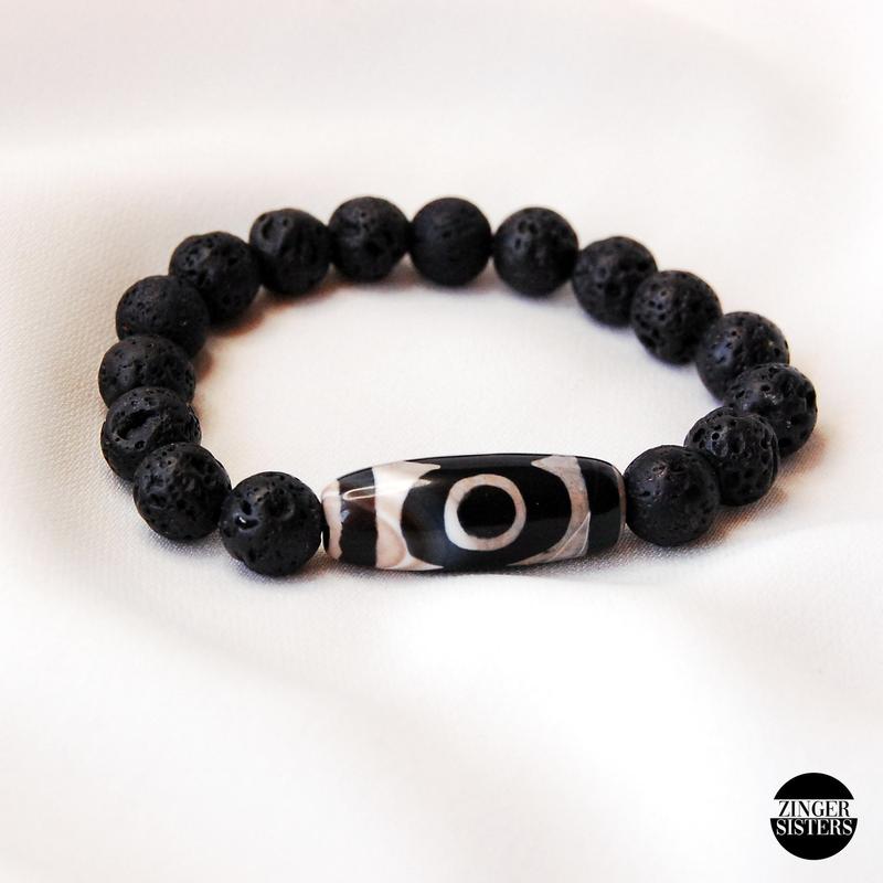 Браслет выполнен из натуральных камней - лавовый камень, агат Дзи Трехглазая.