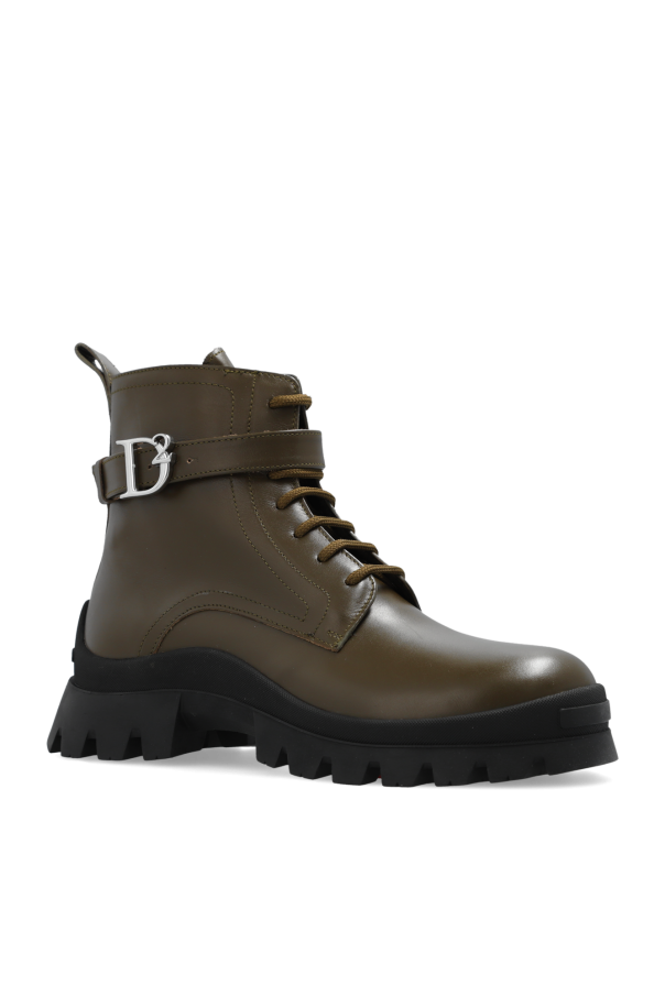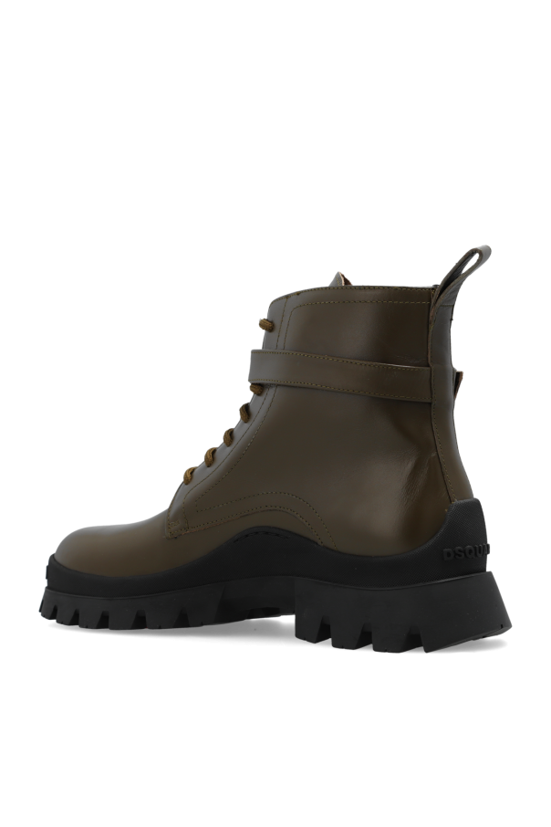 Green combat boots from Dsquared2. Made of leather with an almond-shaped toe, this lace-up model sits on a black rubber sole and features a buckle strap.