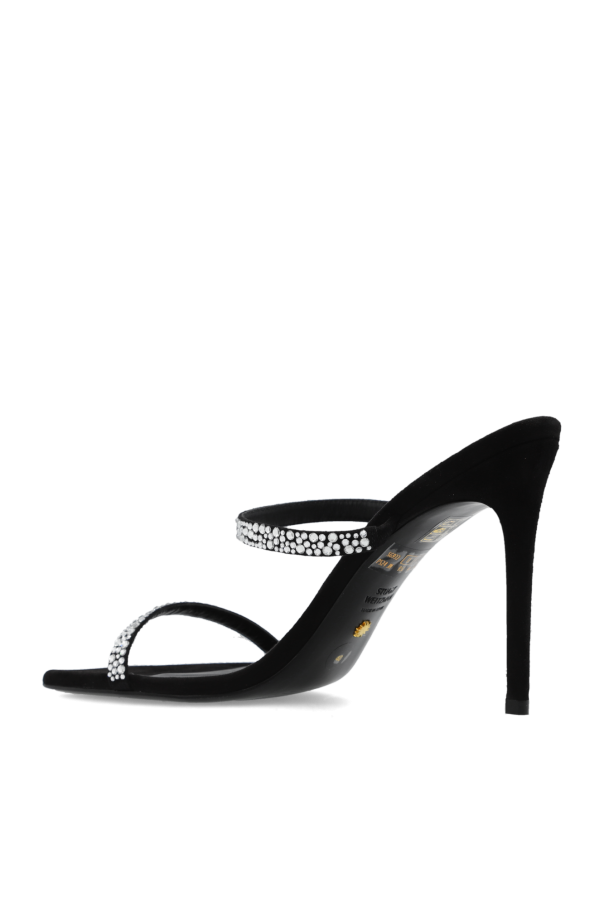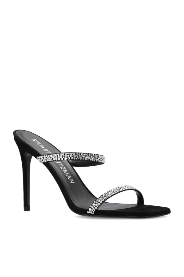 Black ‘Aleena’ mules from Stuart Weitzman. Made of suede and spruced with sparkling appliqués, this model features a square toe and a black leather sole.