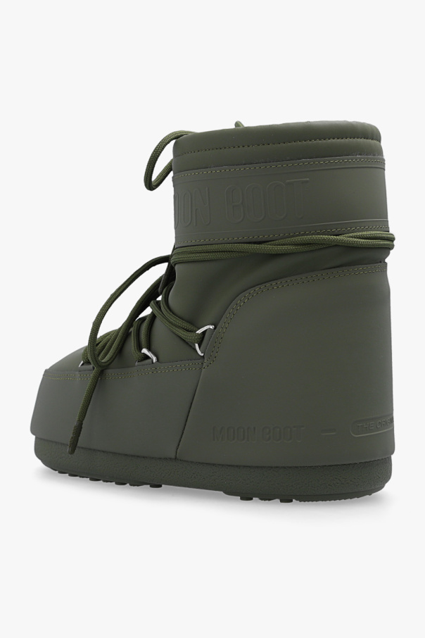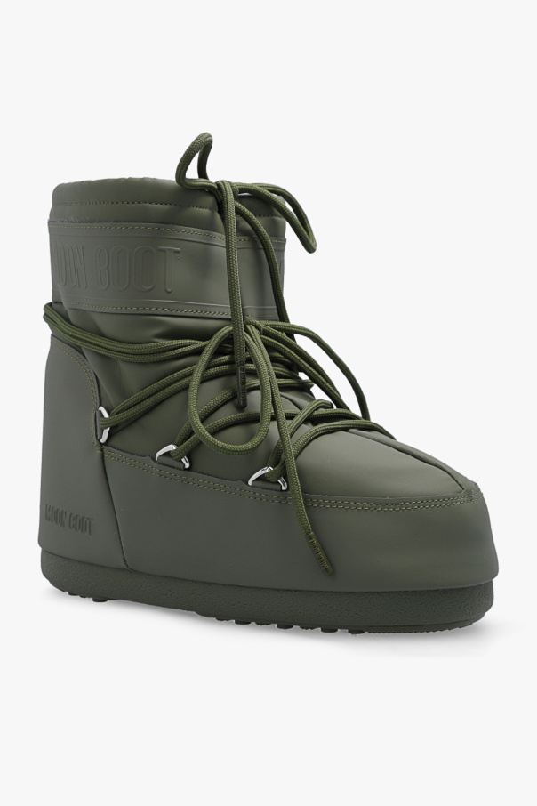 Khaki ‘Icon Low’ insulated snow boots from Moon Boot. Crafted from water-repellent ProTECHt material, this lace-up model showcases the brand\'s logo, a lightweight midsole and suction pads on the rubber tread sole that offer serious ground control. Inspired by the footwear worn by astronauts during the 1969 lunar landing, this project combines technical features with a contemporary look.