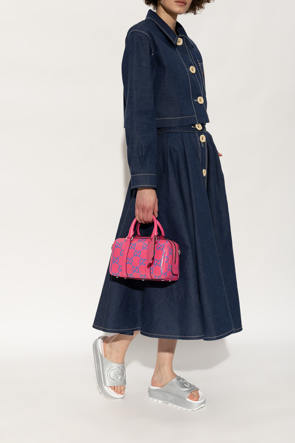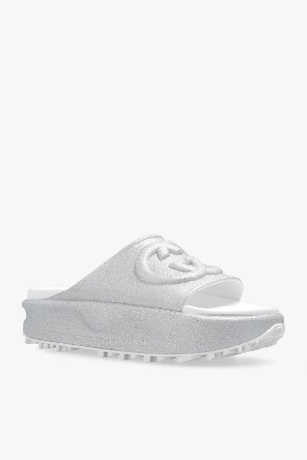 Silver-tone platform slides from Gucci. Spruced up with glitter, this model sits on a white rubber sole and showcases a tactile logo on the front.
