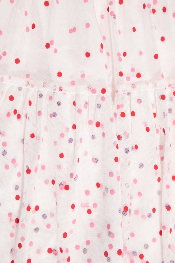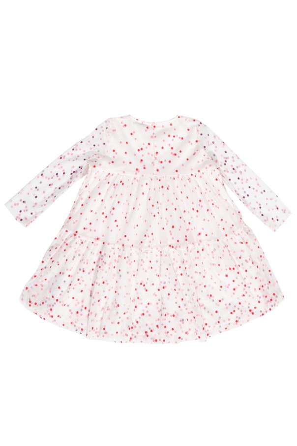White dress from Stella McCartney Kids. Crafted from semi-sheer cotton fabric with pink and red dots and gathers, this item features a round neck, long sleeves and a back zip fastening.