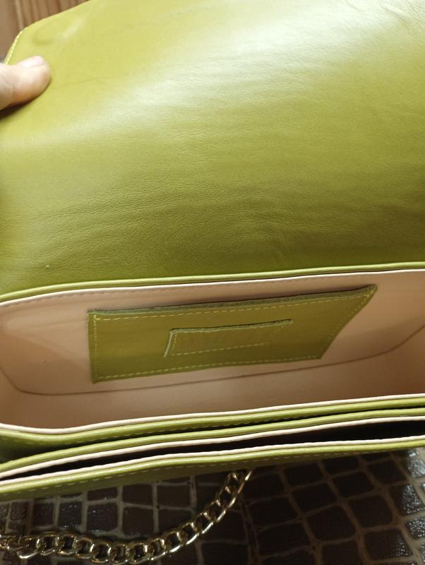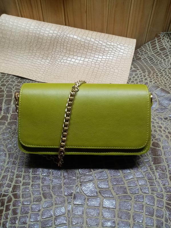Сумочка из натуральной кожи зеленого цвета, имеет два отделения, ручка на плечо цепочку, фурнитура золото. Размеры высота 11.ширина 23 бики7