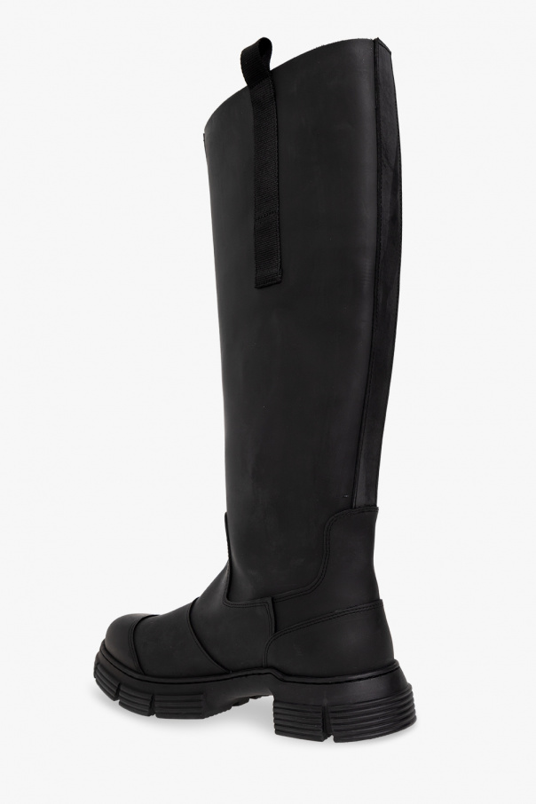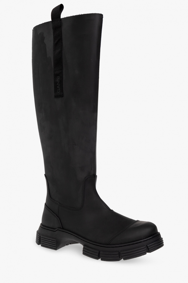 Black rain boots from Ganni. Crafted from recycled rubber, this pair is complete with a logo print and black rubber sole.