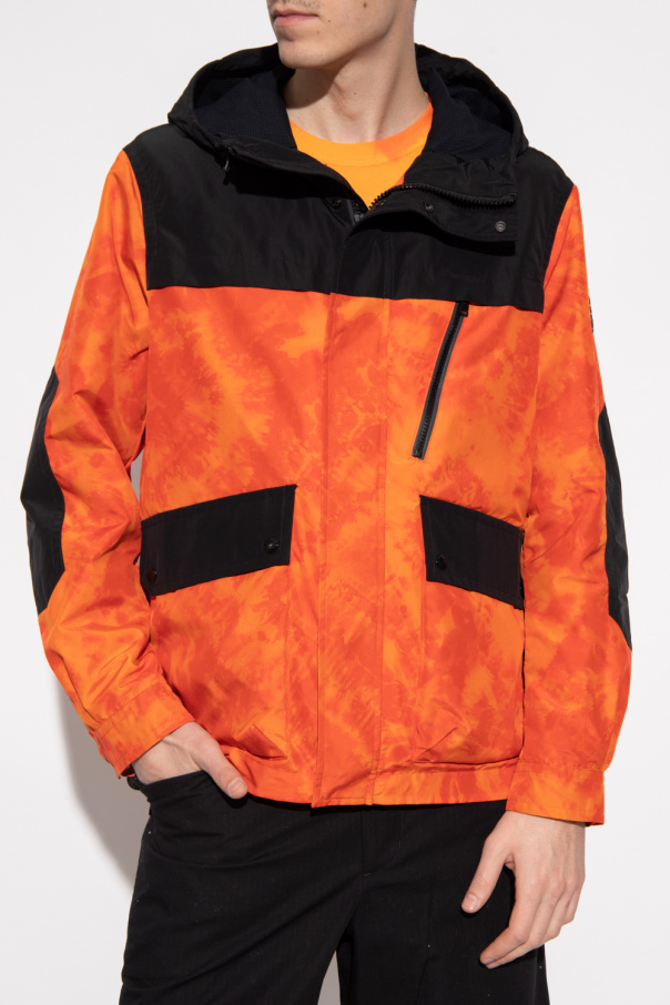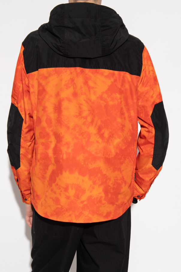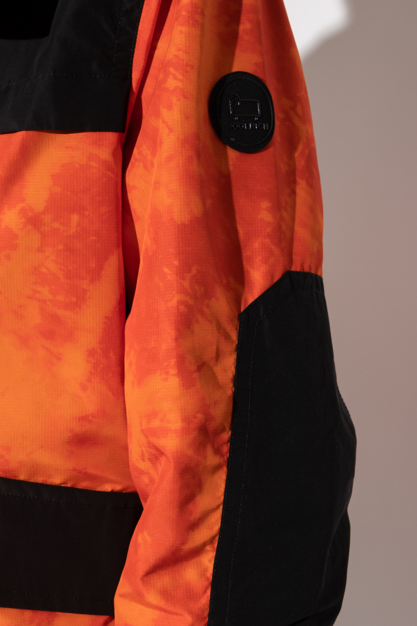 Black and orange jacket with a drawcord-adjustable hood from Woolrich. Illustrated with a tie-dye motif, this style features a two-way zip fastening with a hidden placket, a black logo patch, long sleeves, one zipped pocket and four snap-fastened pockets.