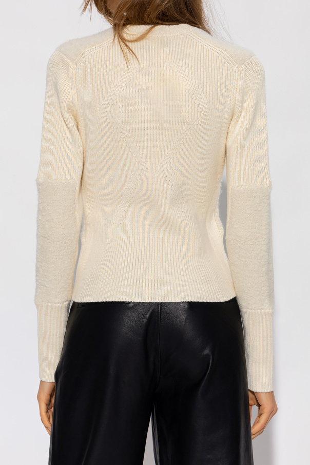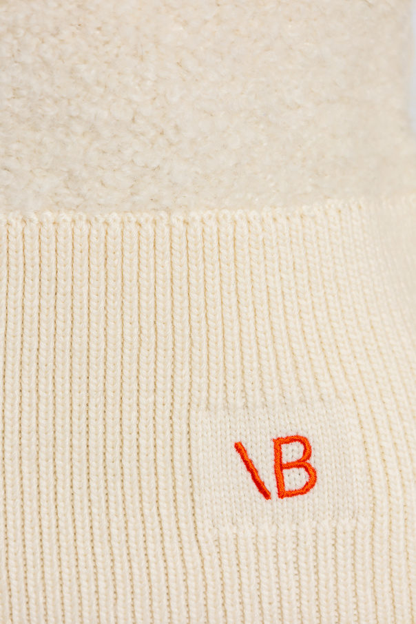 Cream crewneck sweater from Victoria Beckham. Assembled from ribbed patchwork panels, this style features long sleeves and an embroidered red logo on the front.