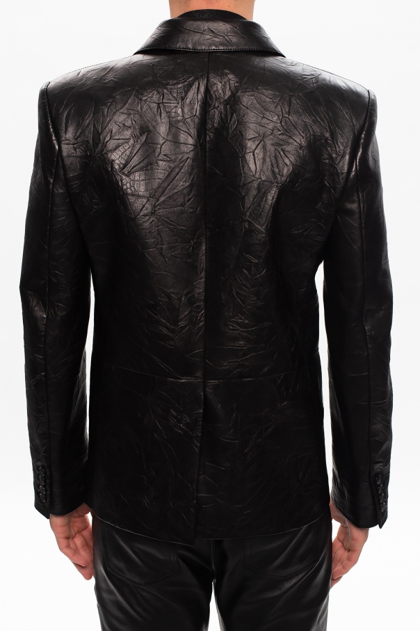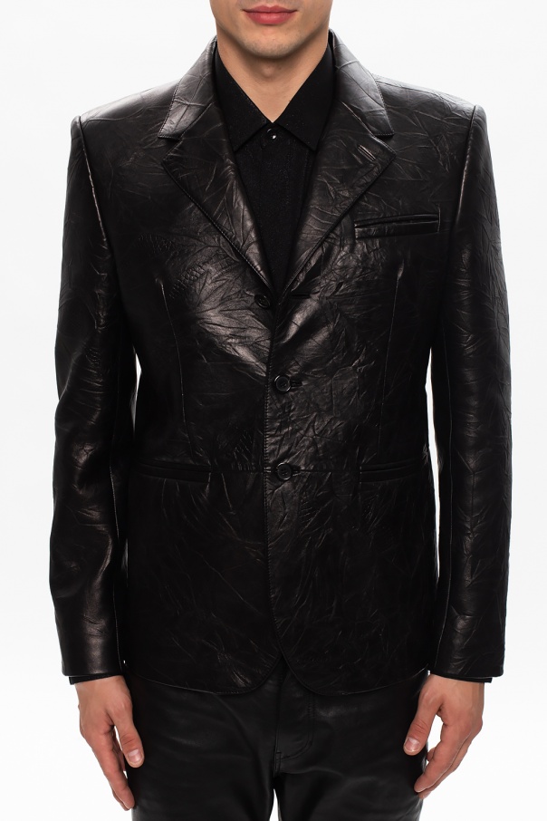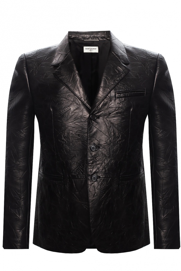 Black jacket from Saint Laurent. Crafted from textured lamb leather, this item features buttons, notch lapels, three front pockets and a single rear vent.