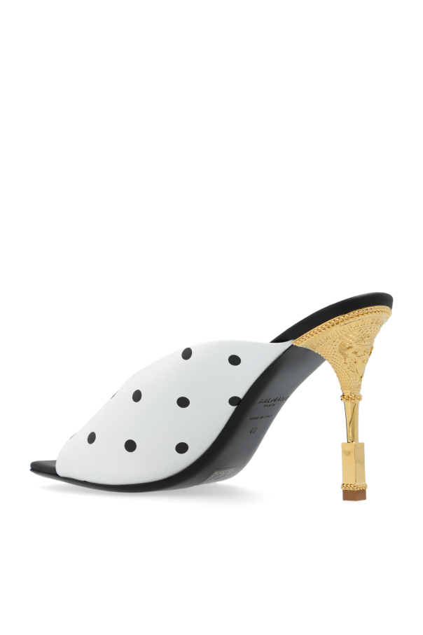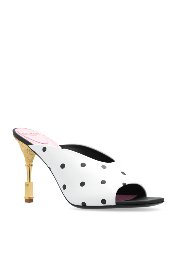 Introducing the ‘Moneta’ Heeled Mules from the esteemed house of Balmain Paris, a synthesis of classic aesthetics and contemporary luxury. These mules captivate with their timeless polka dot pattern against a pristine white backdrop, accented by black dots that exude a retro charm, yet remain undeniably modern. Crafted with meticulous attention to detail, the ‘Moneta’ mules are constructed from the finest leather, both inside and out, ensuring not just superior durability but also unmatched comfort. The open-toe design elegantly frames the foot, allowing for a graceful display of the toes, while the interior boasts a striking pink lining, adding an unexpected pop of color. The pièce de résistance is undoubtedly the slender, gold-textured heel, measuring an impressive 11cm, that elevates the silhouette both literally and figuratively. This unique feature, combined with the discreet yet distinguished pink ‘BALMAIN Paris’ logo on the insole, asserts the mules’ exclusivity and high-fashion pedigree. Why Invest in the ‘Moneta’ Heeled Mules? Exceptional craftsmanship and quality materials, including a full leather construction. Iconic polka dot design paired with a modern gold heel for a striking look. Enhanced comfort and durability, suitable for both day-to-day wear and special occasions. The Balmain Paris branding signifies luxury and an exquisite fashion statement.