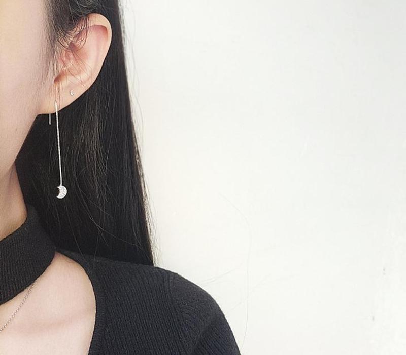 Серьги-протяжки Луна+Звезда с камнями, сережки ниточки РАЗНОЙ ДЛИНЫ, серебряное покрытие 925 пробы