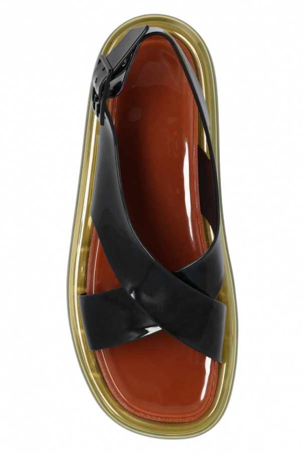 Black ‘Bubble Jelly’ rubber sandals from Tory Burch. Sitting on a green rubber sole with a transparent finish, this model features wide crisscross straps with logo buckles.