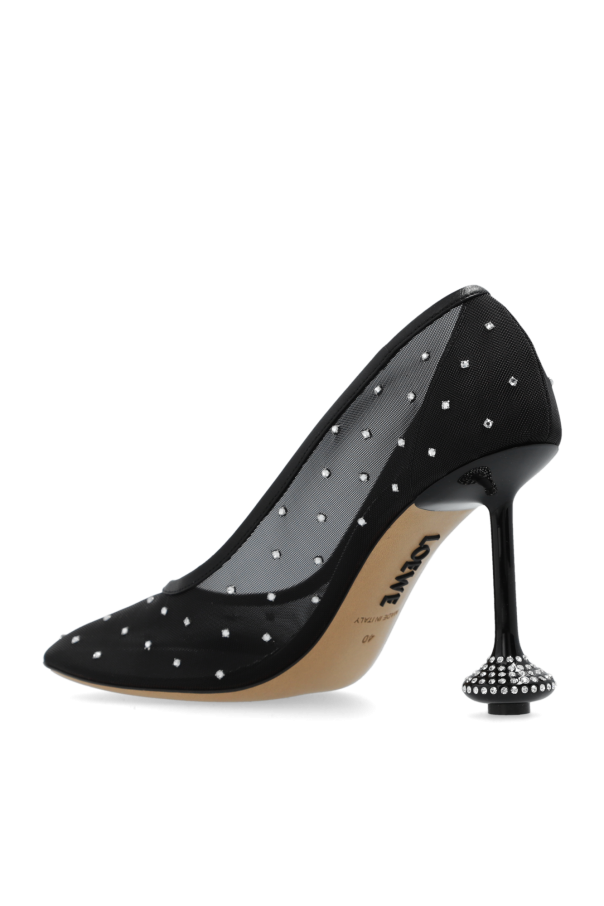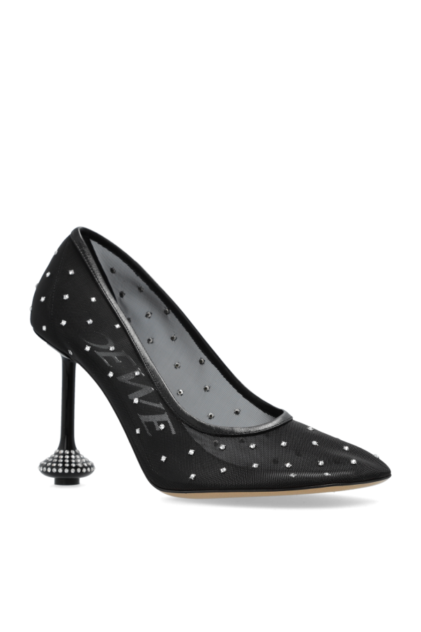 Black ‘Toy’ pumps from Loewe. Made from fabric and decorated with glossy applications, this model sits on a beige leather sole and features a crystal-bejewelled heel.