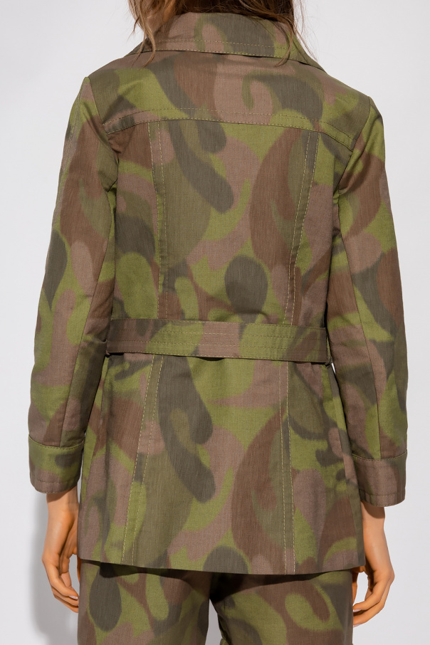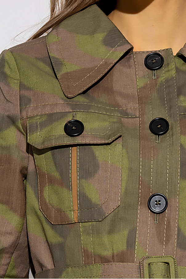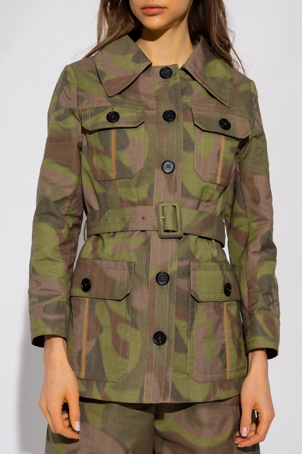 Green, beige and brown jacket from Marni. Made of cotton, this style features button fastenings, a waist-cinching buckle belt, long sleeves and four flapped button pockets on the front.