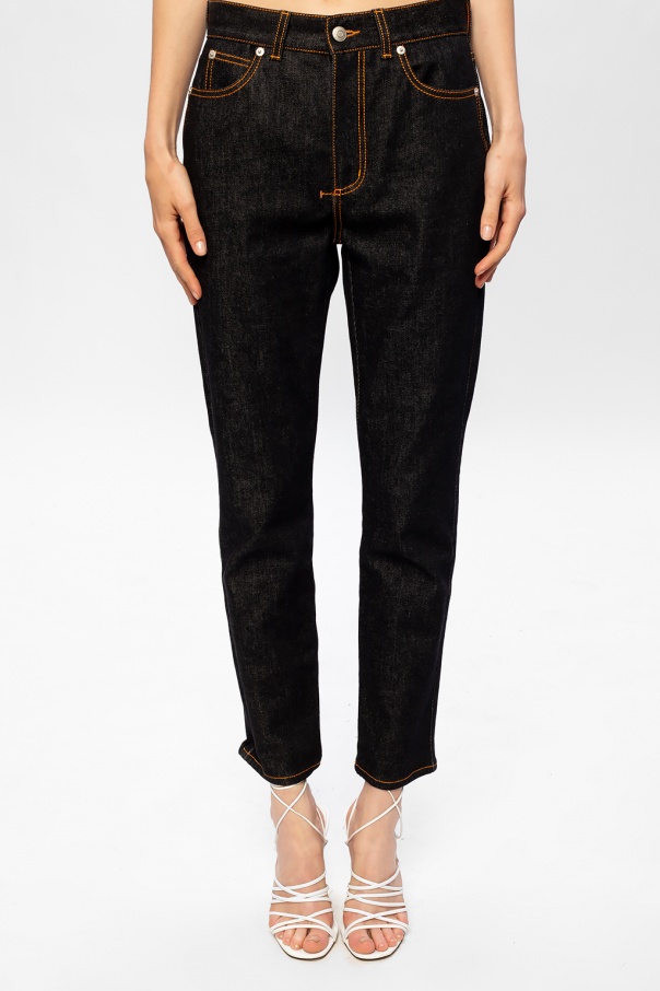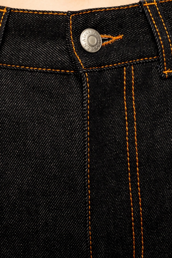 Black jeans from Alexander McQueen. This tapered leg design features a zip and button fastening, five slip pockets, orange stitching details and a black logo patch at the back.
