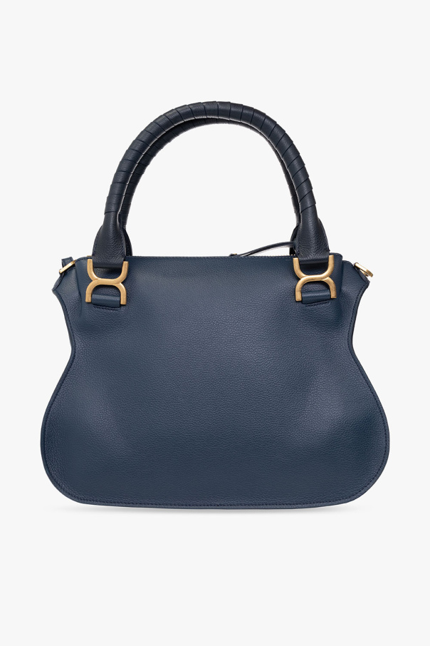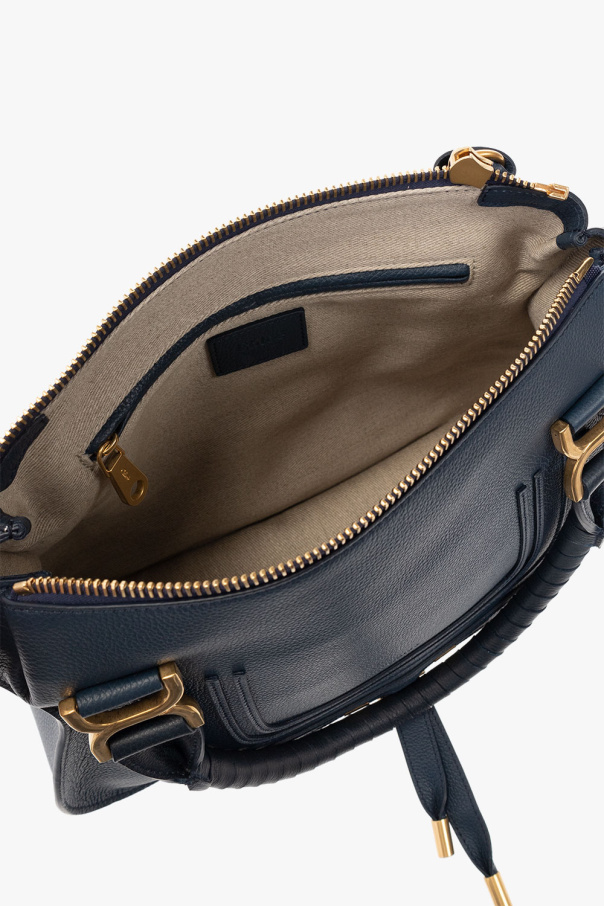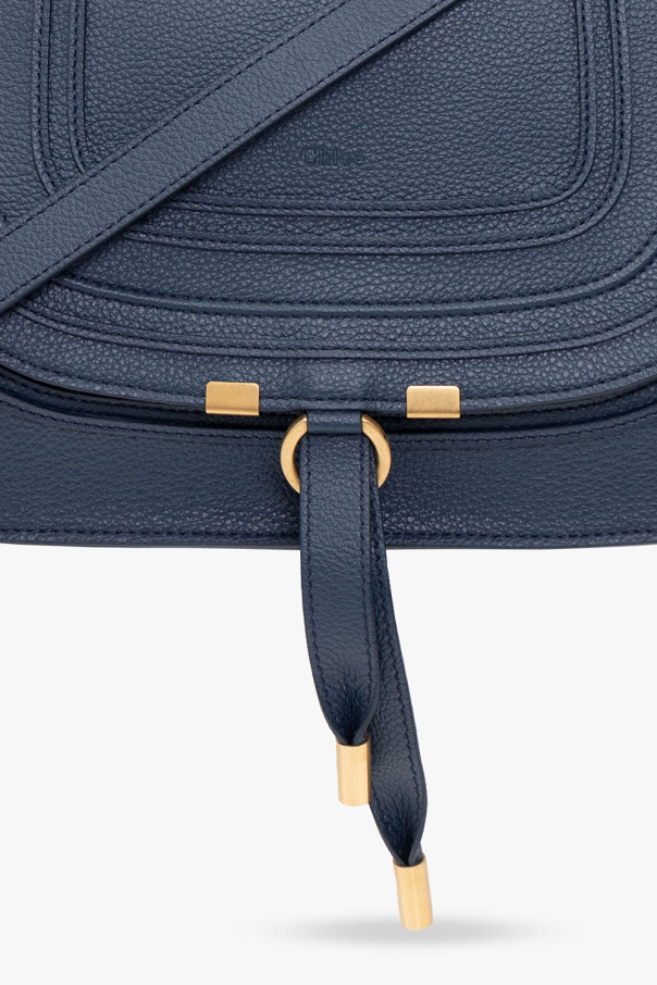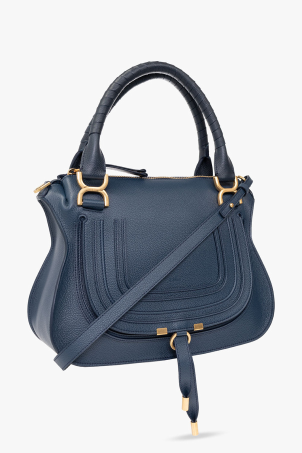 Navy blue ‘Marcie Medium’ shoulder bag from Chloé. Made of calf leather, this design fastens with a zip and showcases an embossed logo and decorative stitching details. It is complete with a flapped front pocket with fringes, two braided handles, detachable and adjustable shoulder strap, gold-tone metal hardware and one one internal compartment with a zip pocket.