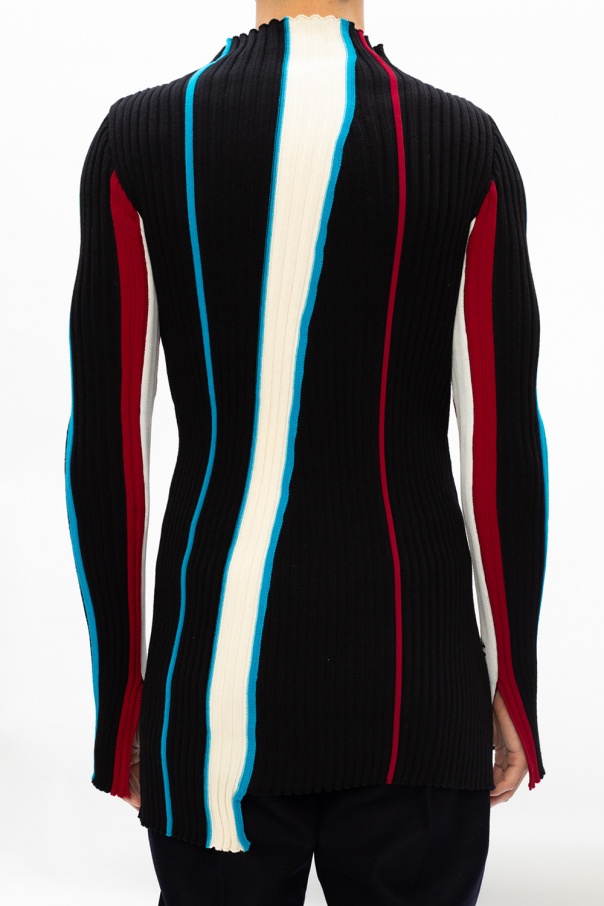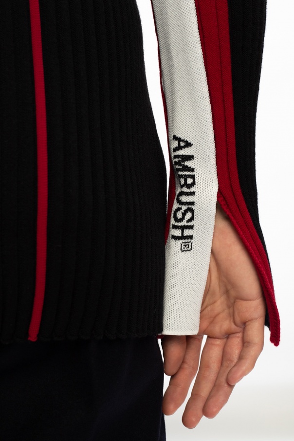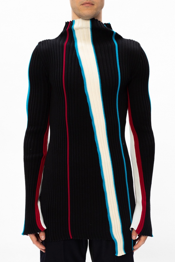 Black ribbed turtleneck top from Ambush. Crafted from cotton, this asymmetrical design is decorated with a stripe pattern in red, cream and blue.