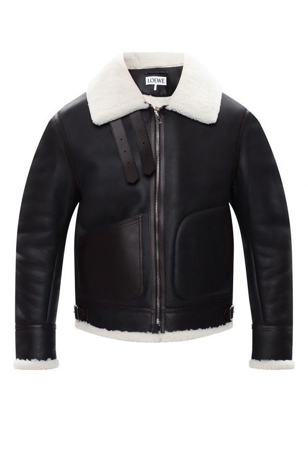 Black, brown and white aviator jacket from Loewe. Crafted in lamb leather, this style fastens via zip and showcases shearling collar and lining, two front welt pockets and adjustable buckle tabs at cuffs.