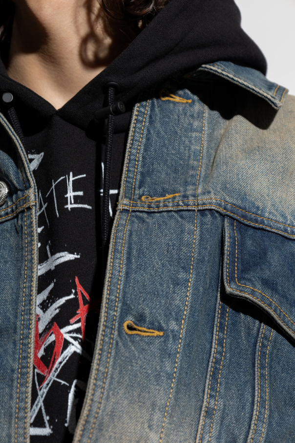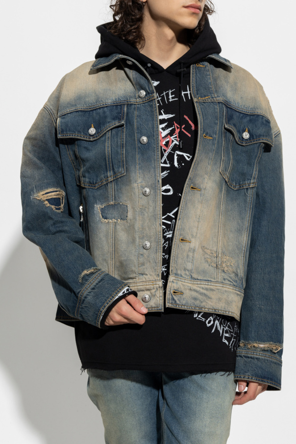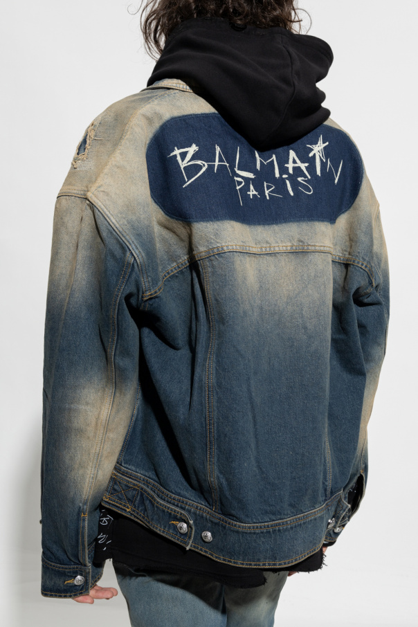 Navy blue and beige denim jacket from Balmain. Crafted from stonewashed cotton with a vintage effect, this style features button fastenings, two zip pockets, two flapped pockets with buttons, and long sleeves with cuffs.