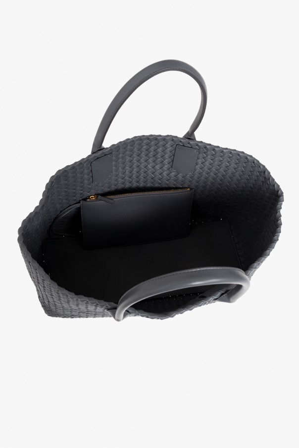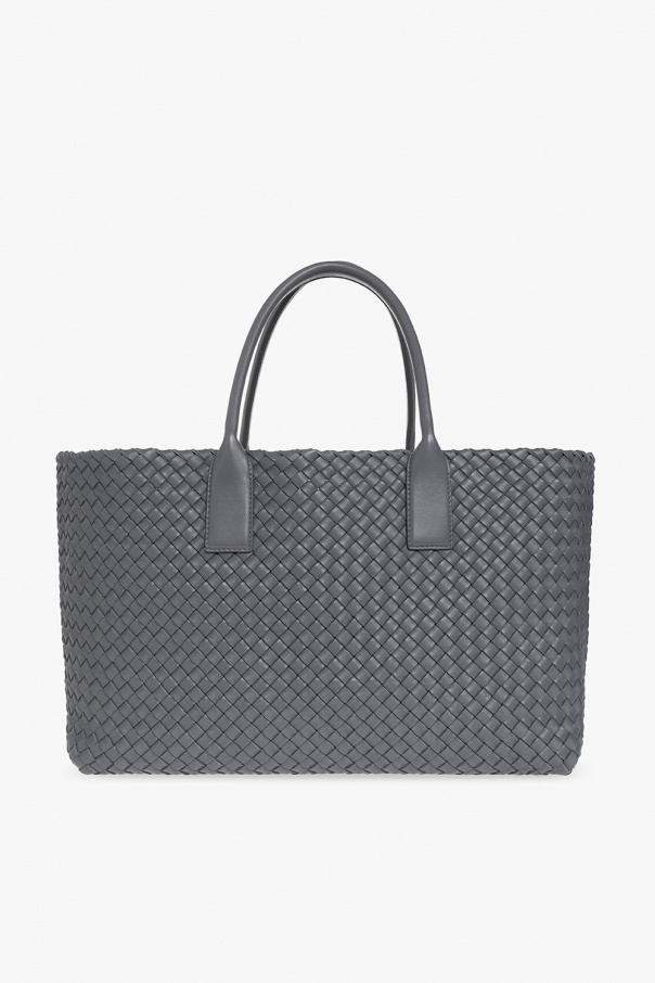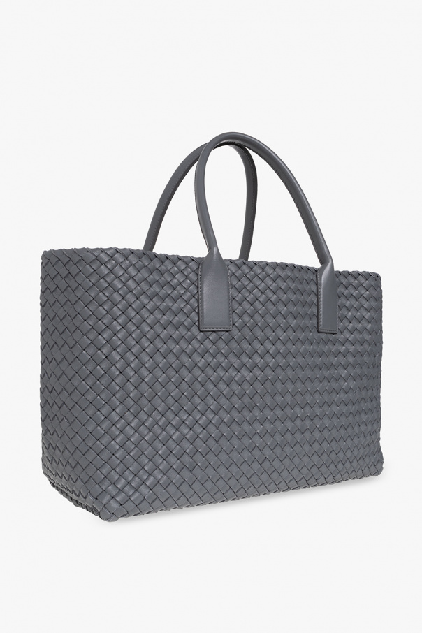 Dark grey ‘Cabat Medium’ shopper bag from Bottega Veneta. Crafted from lamb leather with the brand’s signature Intreccio weave, this model is complete with two half-round handles, gold-tone metal hardware and one internal compartment with a detachable zipped pouch on a strap.