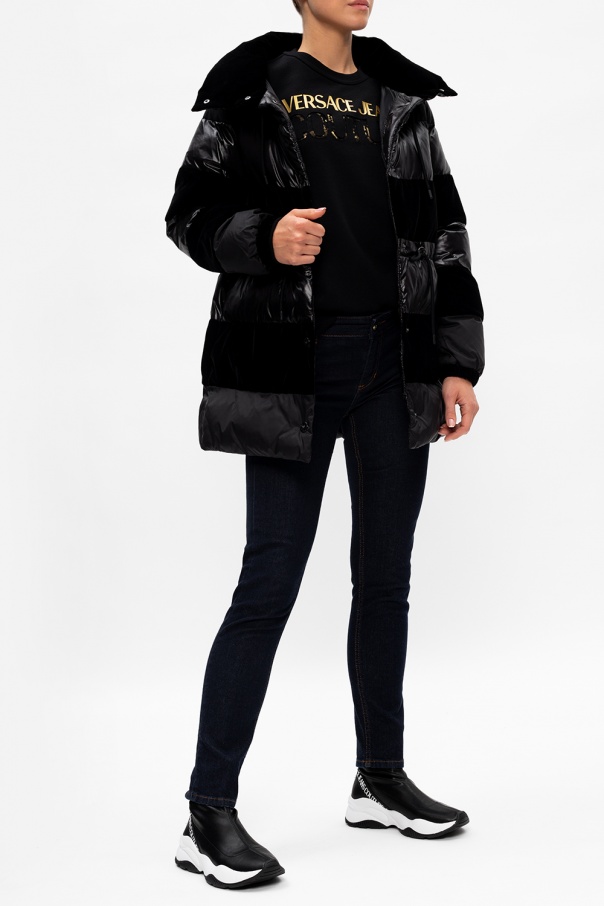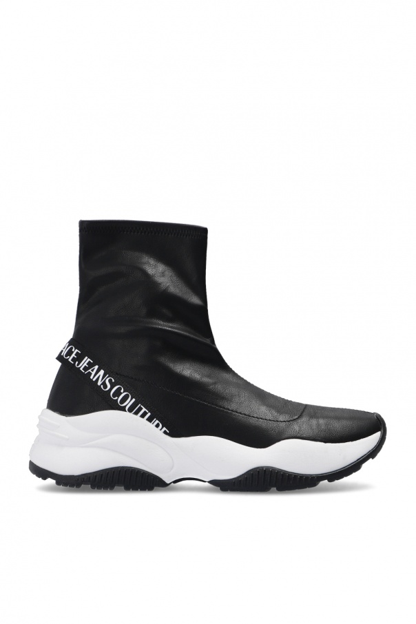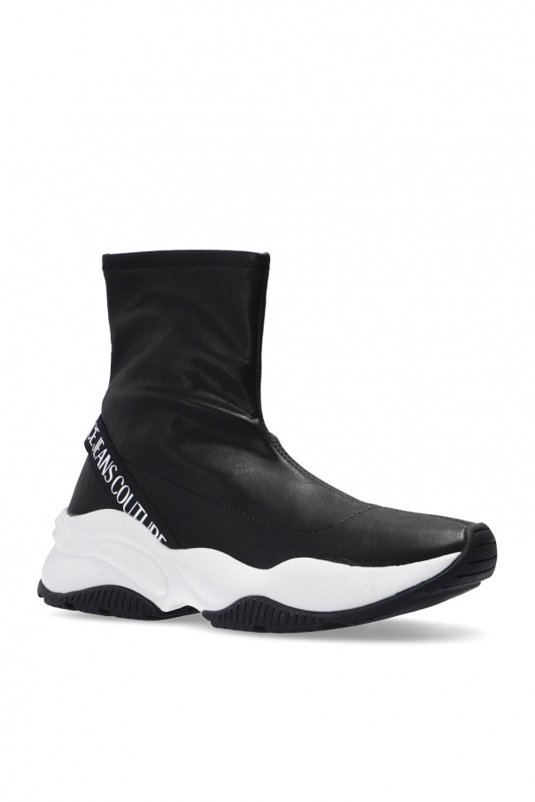 Black and white sneakers from Versace Jeans Couture. Featuring stretch knit upper with sock-like collar and white logo print, this pair rests on a black and white rubber sole.