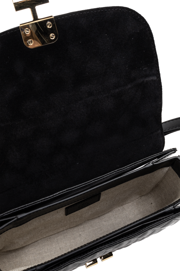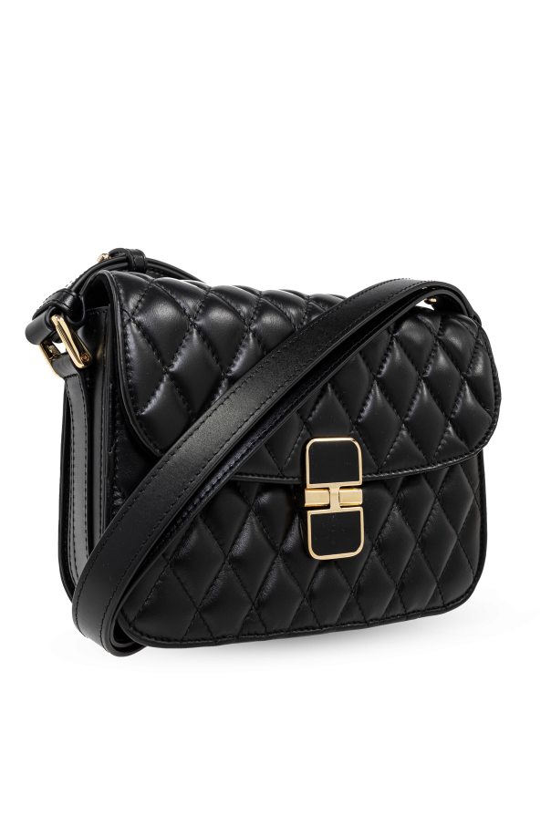 Introducing the \"Grace\" Shoulder Bag by A.P.C., a paragon of exquisite craftsmanship and understated luxury. This medium-sized bag, rendered in a sophisticated black hue, epitomizes elegance with its textured, quilted material that mimics the plush feel of matelassé. The diamond pattern quilting across the bag\'s surface adds a tactile richness, making it a statement piece that complements any ensemble. The \"Grace\" is not only a marvel in design but also in functionality. Its front features a striking gold metal clasp, serving both an aesthetic and practical purpose. The bag\'s long, adjustable shoulder strap offers versatile carrying options, ensuring comfort and ease for the wearer. Further enhancing its elegance are the additional gold metal details, including the rings attaching the strap, which imbue the bag with a touch of opulence. Internally, the \"Grace\" reveals a thoughtfully organized space lined with a light fabric, equipped with three separate compartments and at least one inner pocket, ideal for securing essentials. The use of 100% leather for the inner layer emphasizes the bag\'s luxury status, promising durability and a soft touch. Why Purchase the \"Grace\" Shoulder Bag? Iconic quilted design with a modern twist. Enhanced functionality with its multiple compartments and adjustable strap. Luxurious gold metal accents that elevate the bag\'s aesthetic appeal. Exquisite craftsmanship by renowned designer A.P.C., ensuring quality and durability. Versatile and timeless, perfect for any occasion.