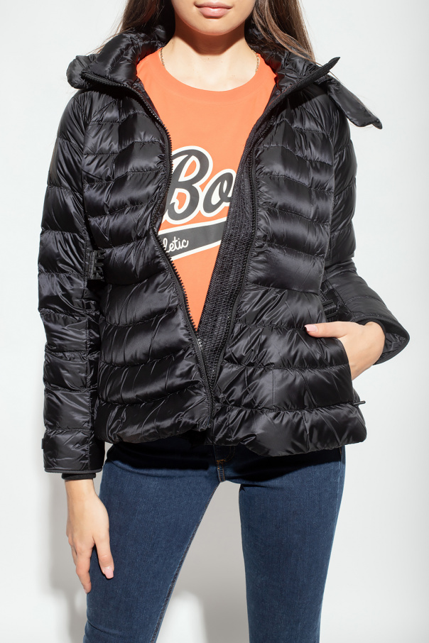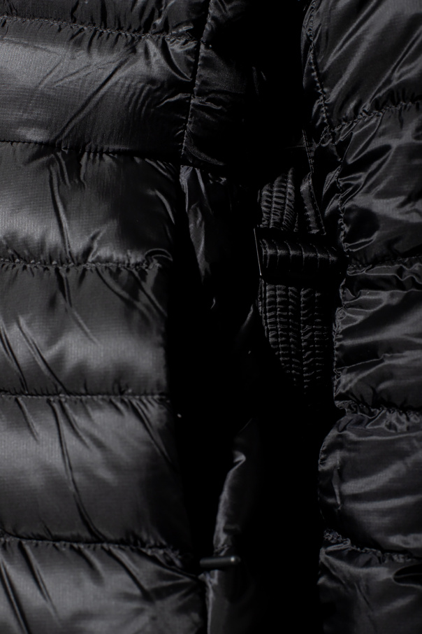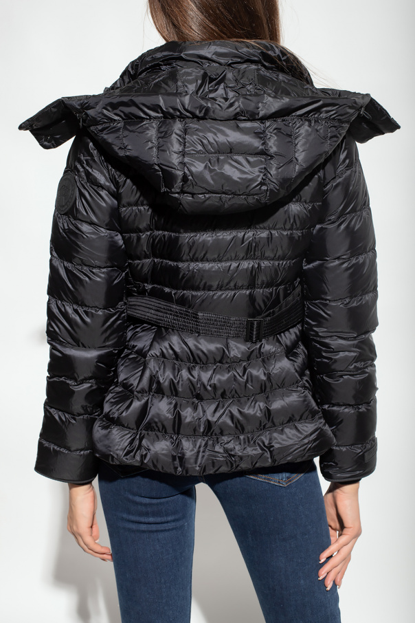 Black down jacket from Canada Goose. Fastened with a two-way zip, this long sleeve design features a detachable drawstring hood with snaps, two zip pockets, buckled waist belt and ribbed cuffs.