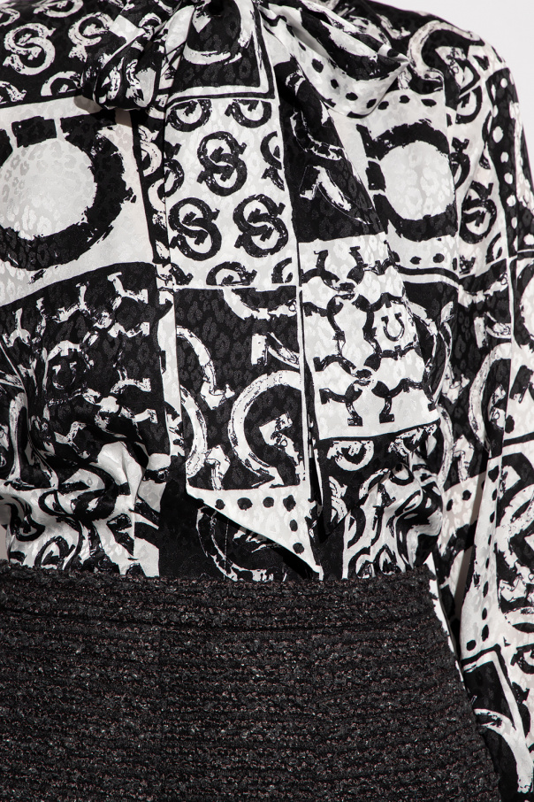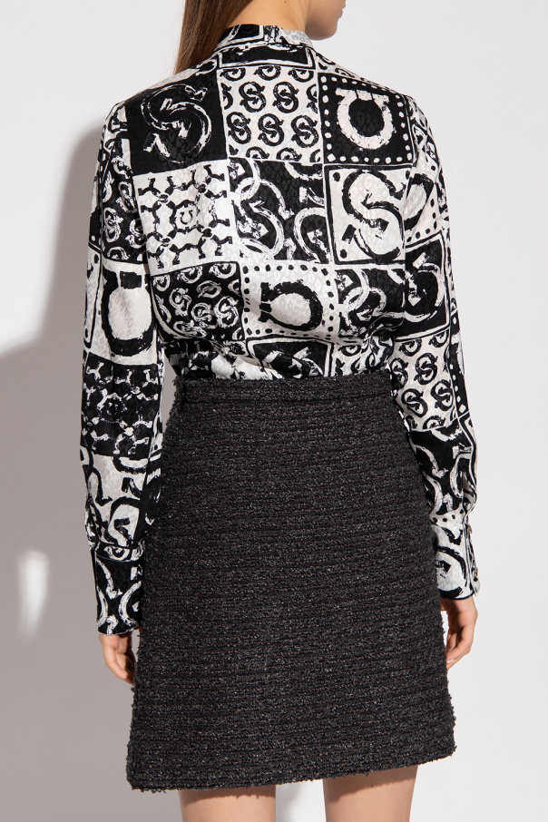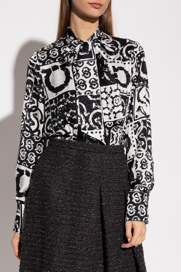 White and black shirt from Salvatore Ferragamo. Made of silk with a fitted silhouette, this style showcases a jacquard pattern, button fastenings with a concealed placket, a decorative sash at the collar and long sleeves with button cuffs.