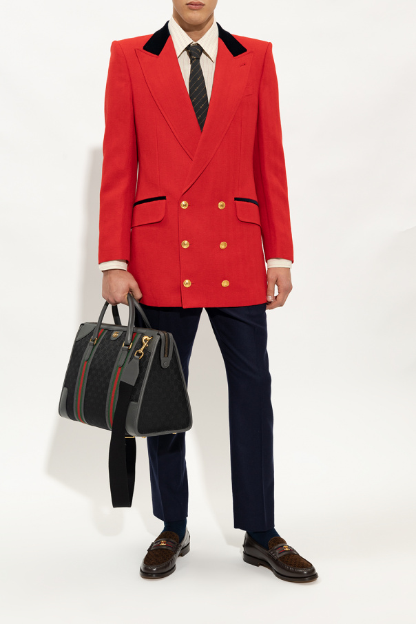 Brown loafers from Gucci. Crafted from leather and trimmed with suede boasting the ‘Square G’ monogram, this model sits on a beige and black leather sole and showcases the brand\'s signature navy blue and red Web stripe and gold-tone ‘Interlocking G’ hardware on the front.