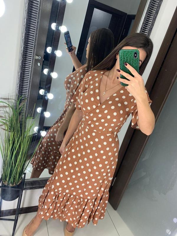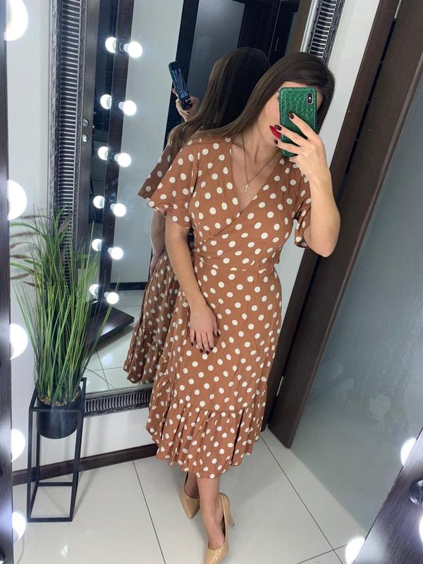 👗Классное коричневое платье миди в горох/платье в горошек на запах/платье миди с рюшами👗