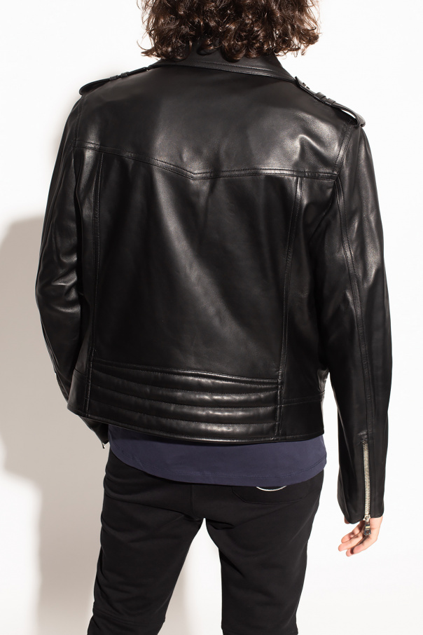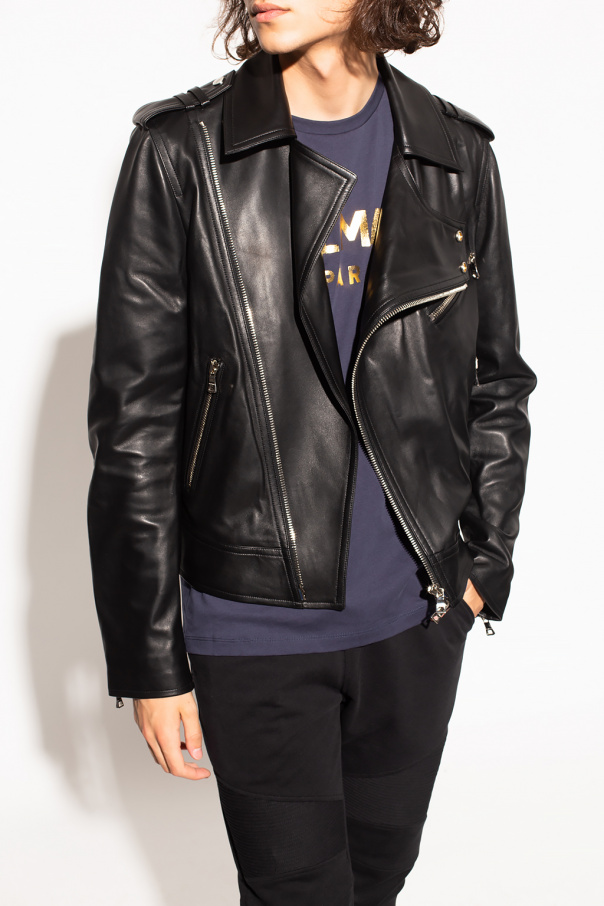 Black biker jacket from Balmain. Made of textured lamb leather, this design features a two-way zip fastening, three zip pockets, epaulettes and silver-tone metal hardware.
