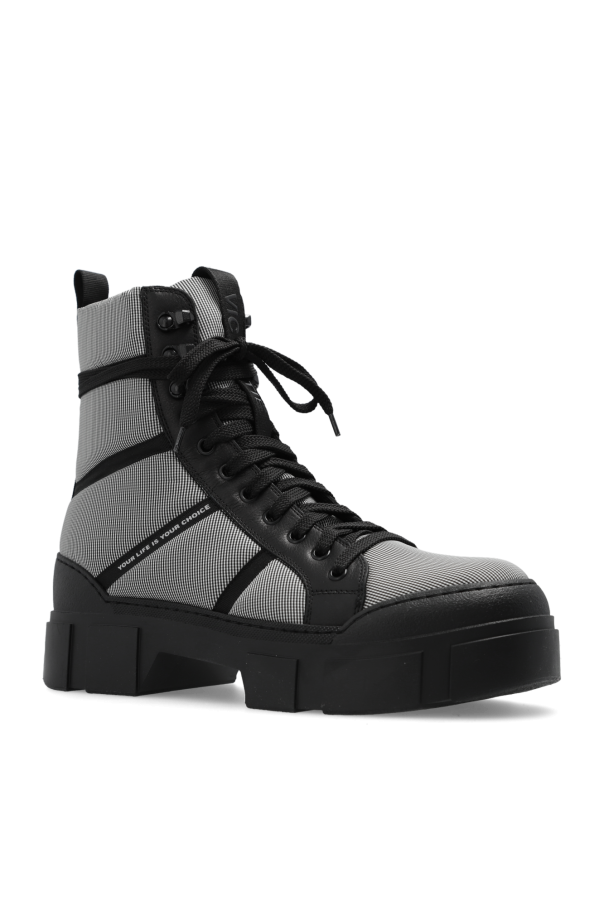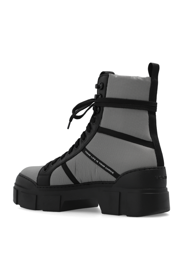 Black and white boots from Vic Matie. Made of fabric with a check pattern and leather trims, this lace-up pair is complete with logo details and a black rubber sole.